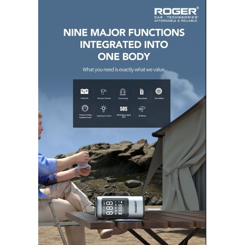 The ROGER 6-in-1 Car Jump Starter is your all-in-one roadside companion—featuring a 1000A jump starter, 150PSI digital tyre inflator, 5000Pa vacuum cleaner, 8000mAh power bank, USB charging, and emergency LED light. Ideal for cars up to 6.0L petrol & 3.0L diesel, it’s perfect for emergencies, travel, and everyday use. Comes with a 2-year warranty for added assurance.