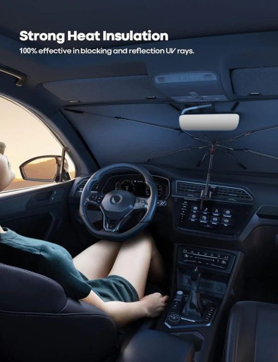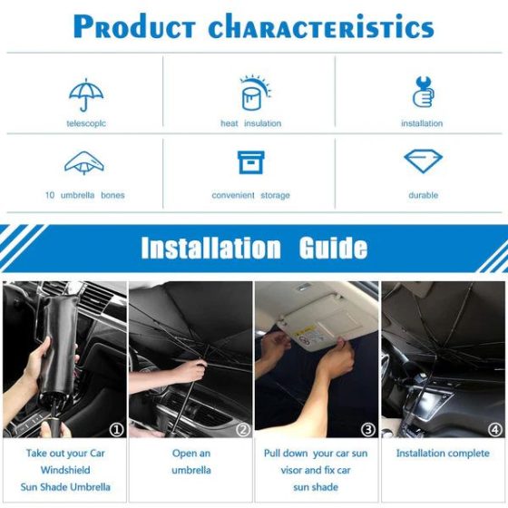 【Easy to fold and store】: Foldable car umbrella, very easy to open and close. A leather storage bag is included in the packaging for more convenient storage. Save space inside your car.