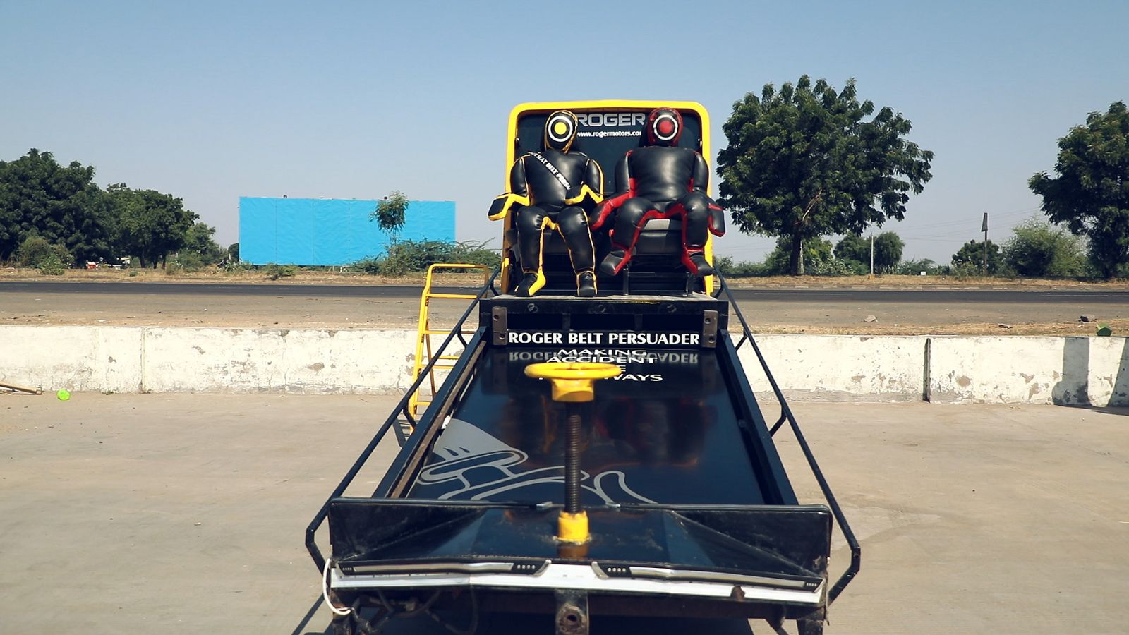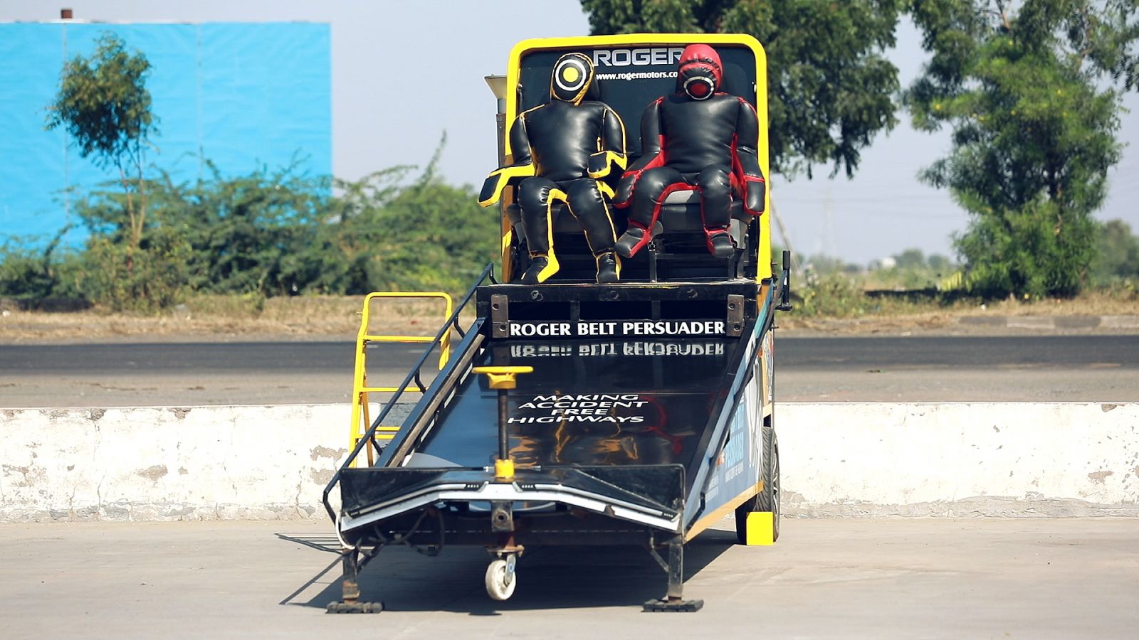 The equipment they used, as already named before, the seatbelt persuader, was the replica of the front seats of a car and the seats were placed on an inclined trolley. On one of the seat, a mannequin was seated while the other seat was for the people to sit upon. They had to wear the seat belt while the mannequin did not wear the seat belt. When the trolley was started, the speed stayed between 10kmph to 15kmph and yet the mannequin, that was without the seatbelt, jolted all the way ahead and down on the floor while the person sitting with the seat belt did not come to any harm.